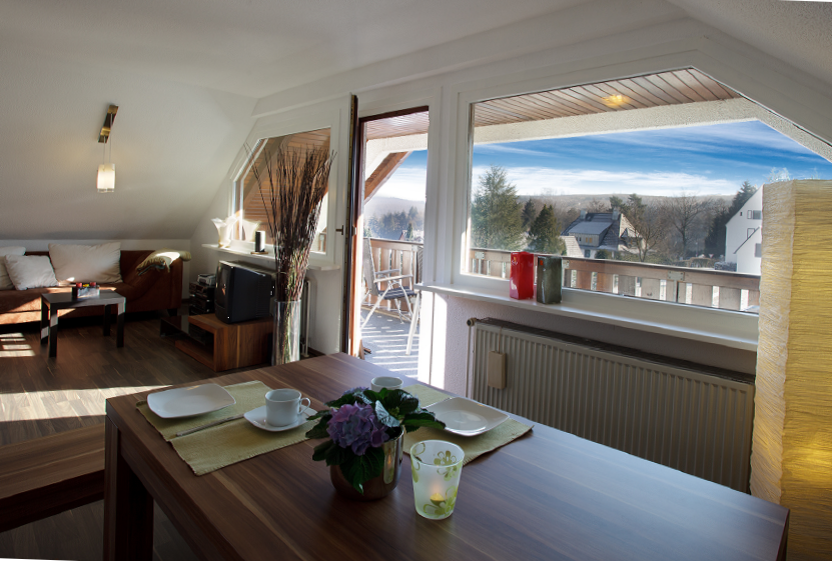 Grosszüger Wohn-/Essbereich. Oder einfach draussen auf dem Balkon. Frühstücken, mit Sonnenliege und Blick auf den nahen Kurwald.